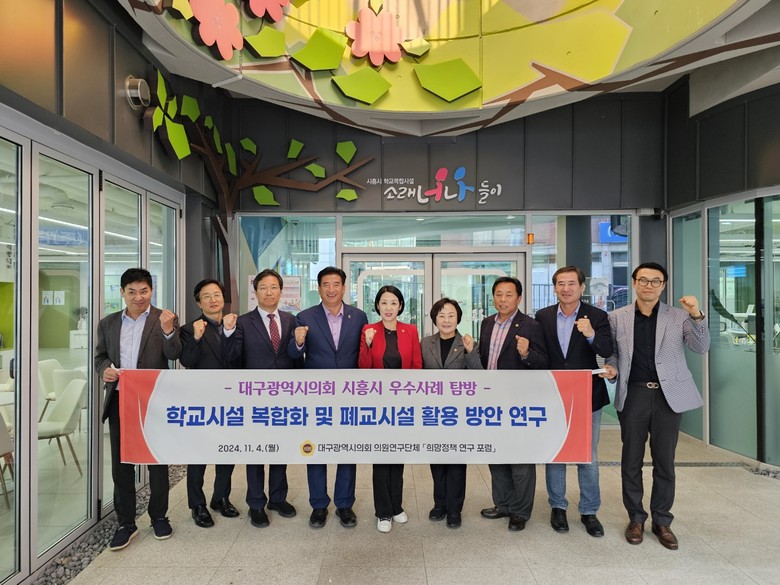 [대구 세계타임즈=한윤석 기자] 대구시의회 의원연구단체인 ‘희망정책 연구 포럼’(대표 손한국 의원)은 11월 4일(월) 학교복합시설 우수사례로 꼽히는 ‘소래너나들이’와 폐교시설을 활용한 공립대안학교인 ‘군서미래국제학교’를 살펴보기 위해 경기도 시흥시를 방문했다.