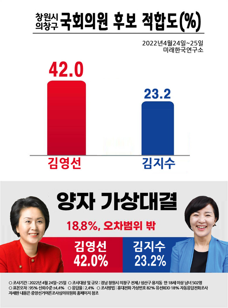 미래한국연구소가 여론조사업체 PNR(피플네트웍스)에 의뢰하여 지난 4월 24일~25일 양일간에 걸쳐 의창구 국회의원 재보궐선거 선거구민 성인 남녀 만18세 이상 502명에 여론조사를 실시해 보았다.