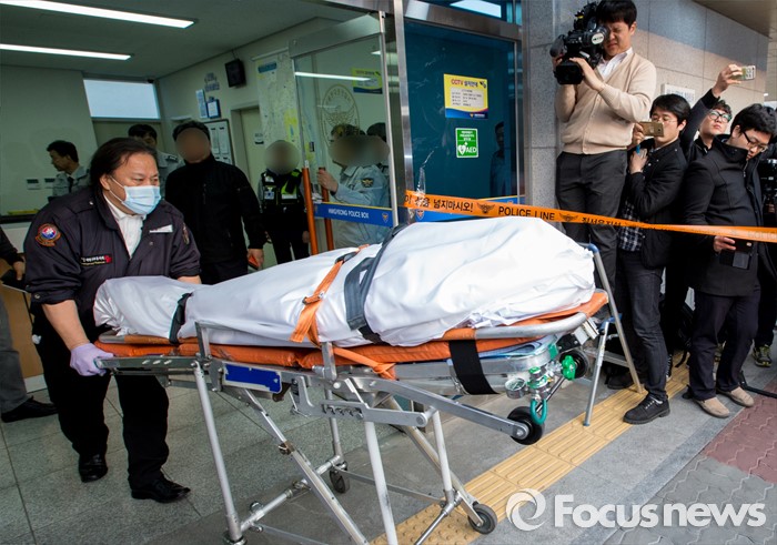 (서울=포커스뉴스) 22일 오후 서울 동대문구 휘경파출소 소속 경위가 2층 숙직실에서 권총 자살한 사건이 발생했다. 이날 사건이 발생한 파출소에서 구급대원이 시신을 구급차로 옮기고 있다.