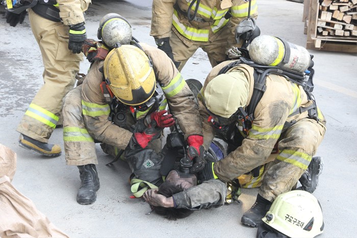 | △ 근로자들 구조하는 대원들 |