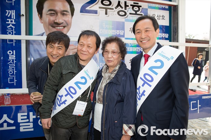 (서울=포커스뉴스) 11일 오후 서울 서대문구 청소년수련관 앞에서 우상호 더불어민주당 서대문구갑 후보가 기념촬영을 하고 있다. 왼쪽부터 영화배우 안내상, 우현,고(故)이한열 열사의 어머니 배은심여사, 우 후보.