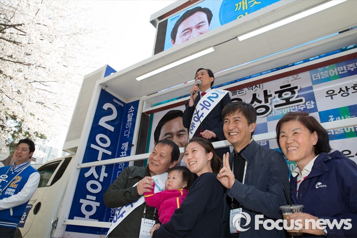 (서울=포커스뉴스) 11일 오후 서울 서대문구 청소년수련관 앞에서 우상호 더불어민주당 서대문구갑 후보가 영화배우 안내상, 우현과 함께 유세를 하고 있다.