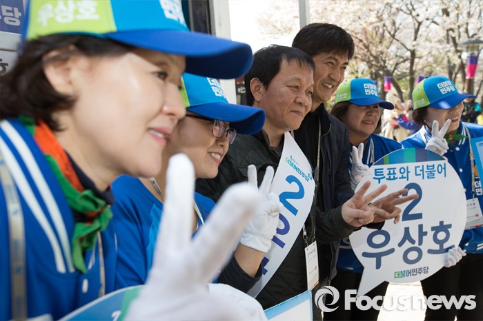 (서울=포커스뉴스) 11일 오후 서울 서대문구 청소년수련관 앞에서 우상호 더불어민주당 서대문구갑 후보가 영화배우 안내상, 우현과 함께 유세를 하고 있다.