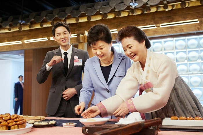 (서울=포커스뉴스) 박근혜 대통령은 11일 오전 서울 중구 한국관광공사 서울센터에서 열린 K-스타일 허브(K-Style Hub) 한식문화관 개소식에서 배우 송중기 및 윤숙자 한식재단 이사장 등과 함께 다과를 만들고 있다. <사진출처=청와대>