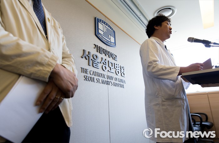 (서울=포커스뉴스) 26일 오후 서울 서초구 서울성모병원에서 서울성모병원 응급의학과 주치의 임지용 교수가 탤런트 김성민 자살시도 관련 브리핑을 하고 있다.