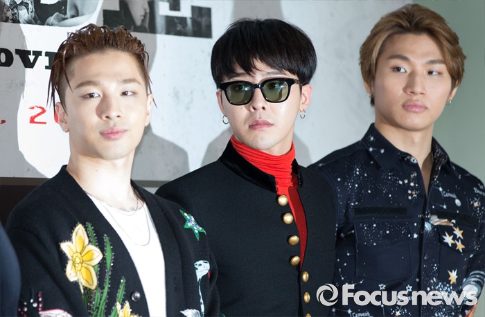 (서울=포커스뉴스) 28일 오후 서울 CGV 영등포점에서 영화 '빅뱅 메이드' VIP 시사회에 참석한 빅뱅이 포즈를 취하고 있다. 왼쪽부터 태양, GD, 대성.