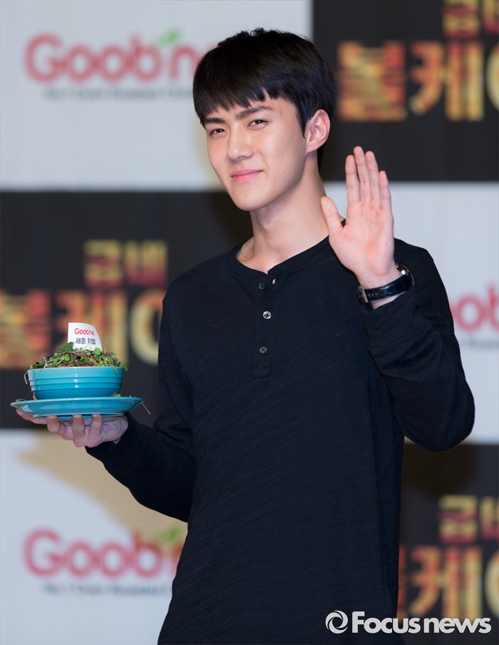 (서울=포커스뉴스) 29일 오후 서울 강남구 일지아트홀에서 열린 '굽네 볼케이노와 함께하는 엑소(EXO) 치밥 쿠킹 팬사인회'에서 세훈이 포즈를 취하고 있다.