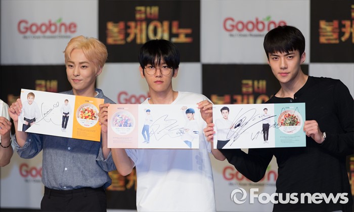 (서울=포커스뉴스) 29일 오후 서울 강남구 일지아트홀에서 열린 '굽네 볼케이노와 함께하는 엑소(EXO) 치밥 쿠킹 팬사인회'에서 시우민(왼쪽부터), 백현, 세훈이 포즈를 취하고 있다.