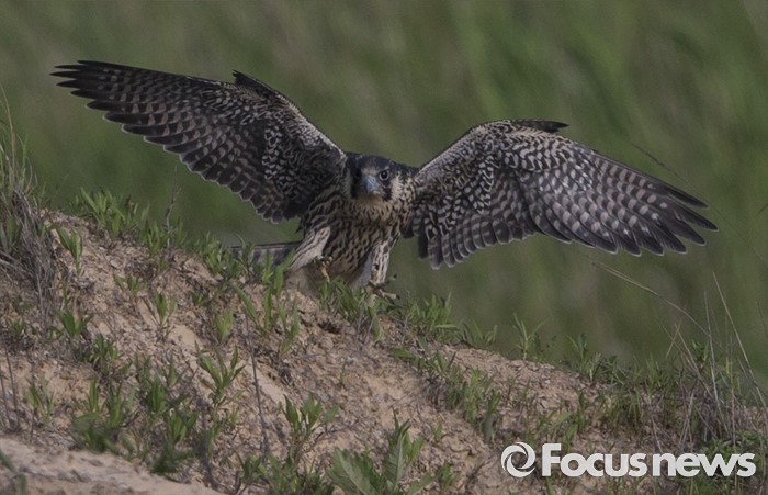 (인천=포커스뉴스)송골매 유조 암컷이 인천시 수도권 매립지 언덕에서 낮은 곳으로 할강하기 위해 발진하고 있다.