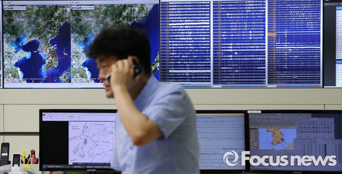 (대전=포커스뉴스) 6일 오전 대전 유성구 한국지질자원연구원 지진연구센터에서 직원들이 지진상황을 모니터 하며 분주한 모습을 보이고 있다. 지난 5일 오후 8시 33분께 울산 동구 동쪽 52㎞ 해상에서 규모 5.0의 지진이 발생했다.