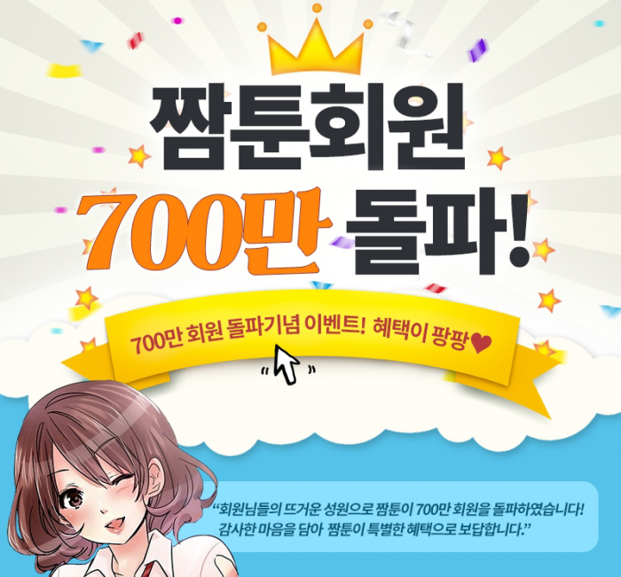 짬툰은 700만 돌파를 기념하기 위해 회원들을 대상으로 2가지 이벤트를 동시 진행한다. 오는 17일까지 총 11일 동안 코인을 충전하는 모든 회원들에게 보너스 코인 10%을 추가 지급한다.
