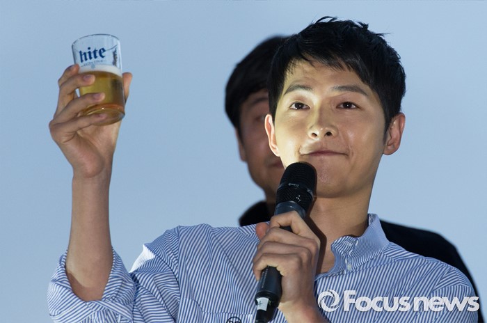 (서울=포커스뉴스) 14일 오후 서울 서대문구 신촌 일대에서 열린'제2회 신촌맥주축제'에 참석한 배우 송중기가 팬들에게 건배 제의를 하고 있다.